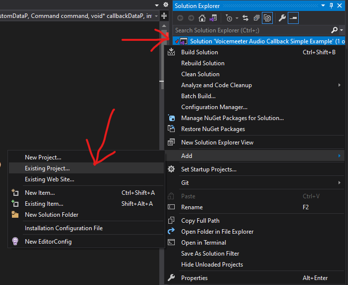 - Open context menu (right mouse button click) -> Add -> Existing Project...