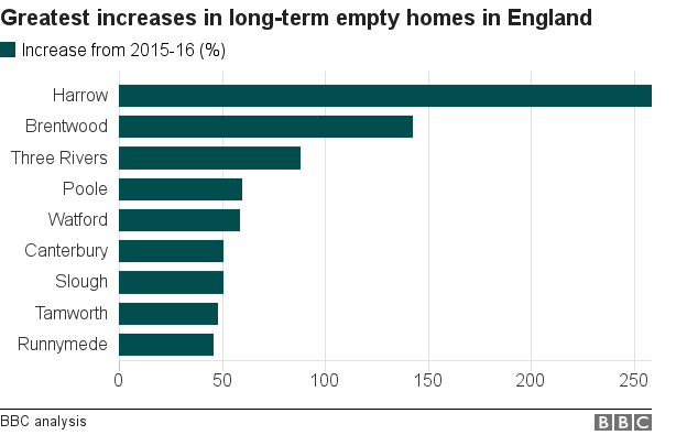 In November 2017 the BBC Shared Data Unit reported London's commuter belt had seen a spike in the number of homes left long-term empty despite a downward trend across the UK since 2010.