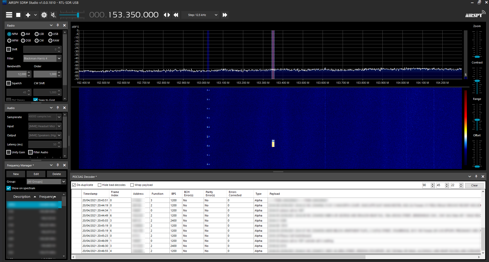NFM with 12kHz bandwidth seems to work reliably, input is taken directly from the demodulator so audio filtering / mute shouldn't affect decoding.