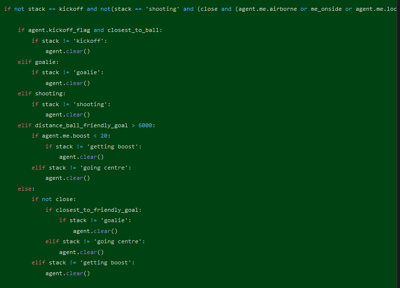 Stack is now cleared whenever decision making code decides bot should be do something else unless: going for kickoff or shooting and close and (agent.me.airborne or me_onside or agent.me.location.y * side(agent.team > 2500 * -side(agent.team)). This is to prevent bot cancelling a shot when it's already committed.