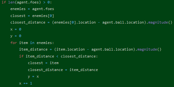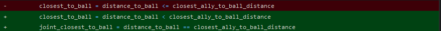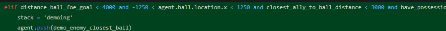 Added very_close variable because I wanted distances where bot moves away from ball to prevent scoring own goals and distance where bot wouldn't cancel shot because already committed to be different. So now very_close is used for the own goal preventing and has a range of 500, while close is used for not shot cancelling with a range of 1000