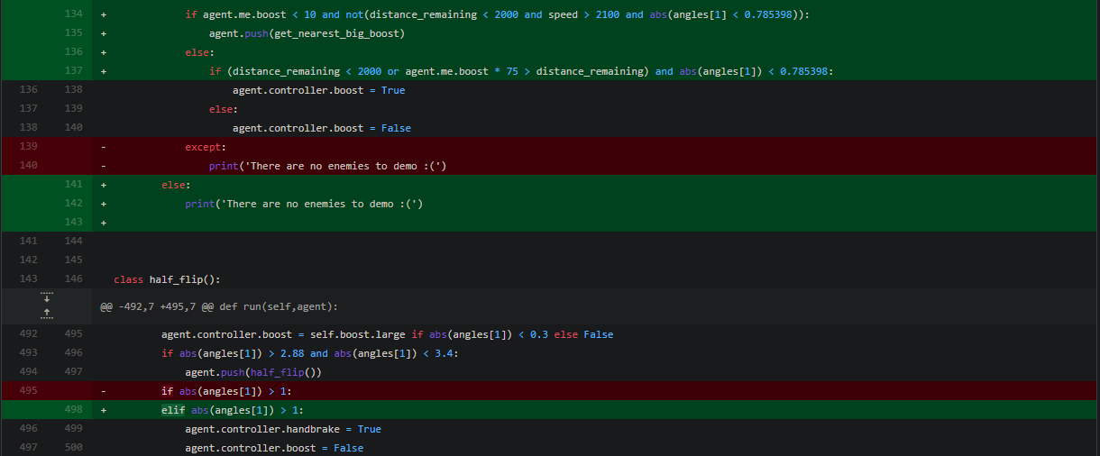 Added stack == 'getting boost' and agent.me.boost < 20 as a condition to not clear stack because often bot would not have any boost because it kept clearing stack everytime it tried to get some. Now it doesn't clear stack while getting boost unless boost > 20.