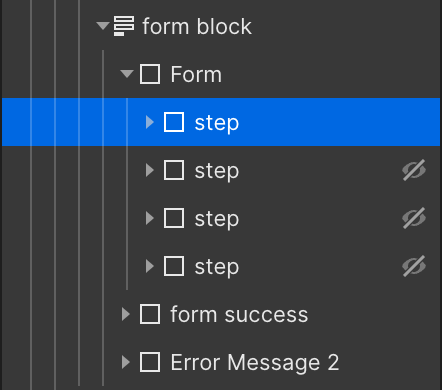 Only one Webflow form element is used. Every form step is organized into a single div block called step.