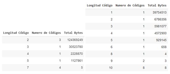 Summary tables of generated code lengths for the SARS-CoV-2.fasta e Información and el universo holográfico.txt data sets from left to right