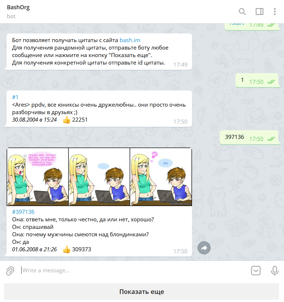 Бот позволяет получать цитаты с сайта башорг Для получения рандомной цитаты, отправьте боту любое сообщение или нажмите на кнопку "Показать еще". Для получения конкретной цитаты отправьте id цитаты.