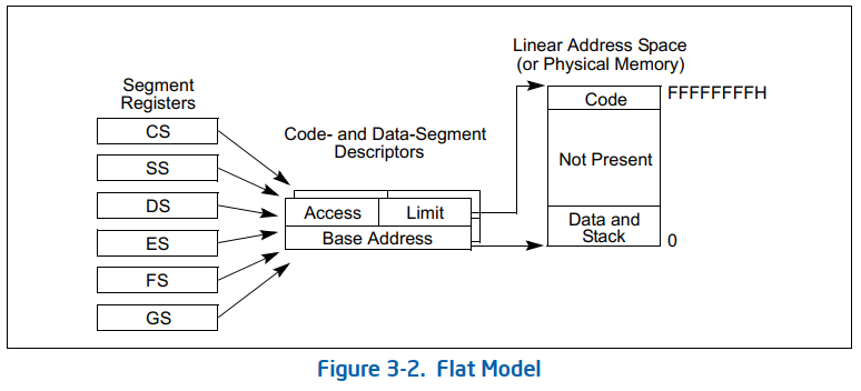 - When using the flat (unsegmented) memory model, segment registers are loaded with segment selectors that point to overlapping segments, each of which begins at address 0 of the linear address space. These overlapping segments then comprise the linear address space for the program.