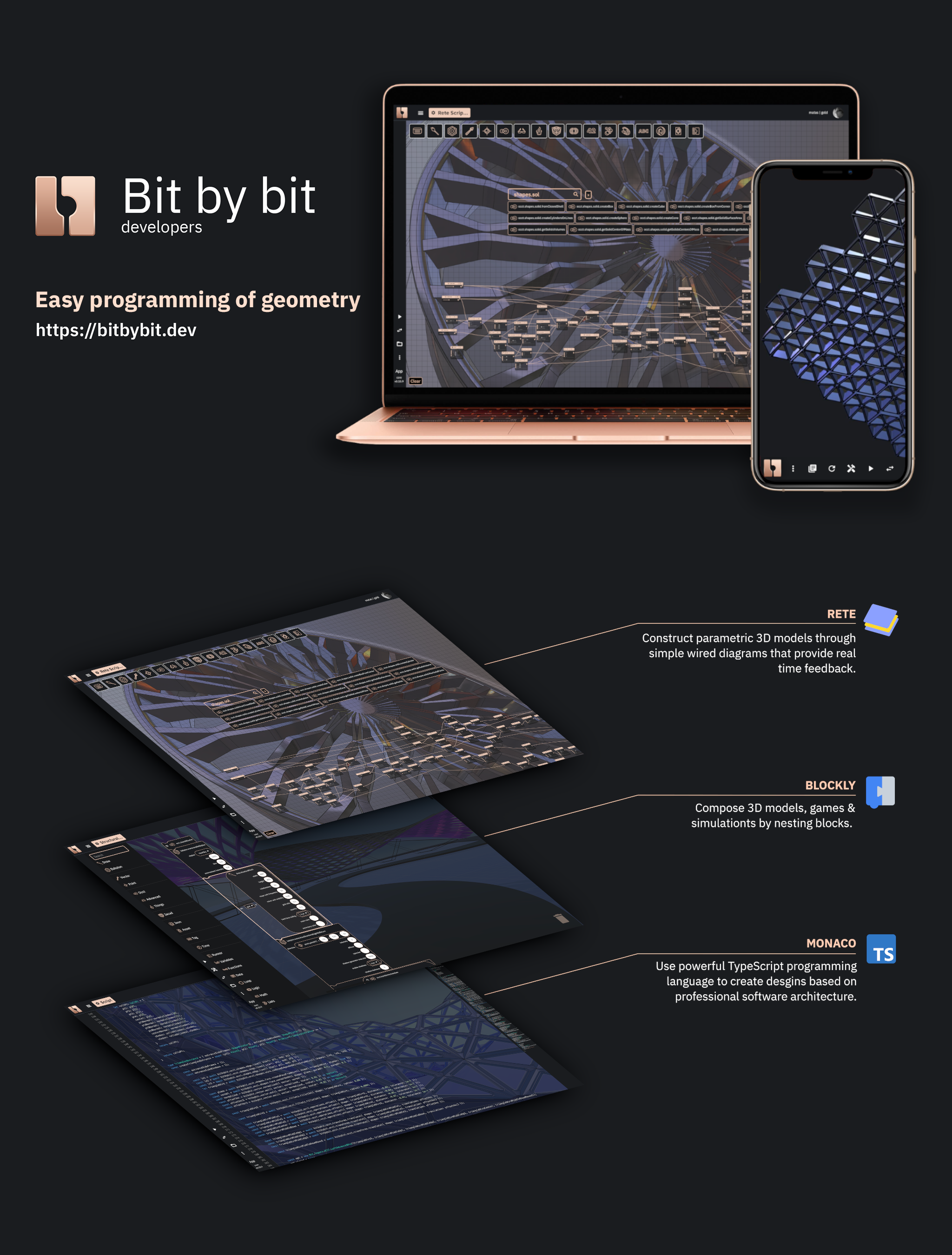 Bit By Bit Developers web platform allows creators to program geometry through simple visual programming language or choose monaco typescript editor with full intellisense of bitbybit API. This cloud platform can fulfil many practical, educational and artistic needs of its users. Through familiar programming interface used in tools such as Scratch and Blockly.Games we expose powerful 3D algorithms that make it easier to implement various parametric tasks. Our goal is to make it very simple for users to share their ideas and designs. We want to encourage everyone to engage in the future of this tool.