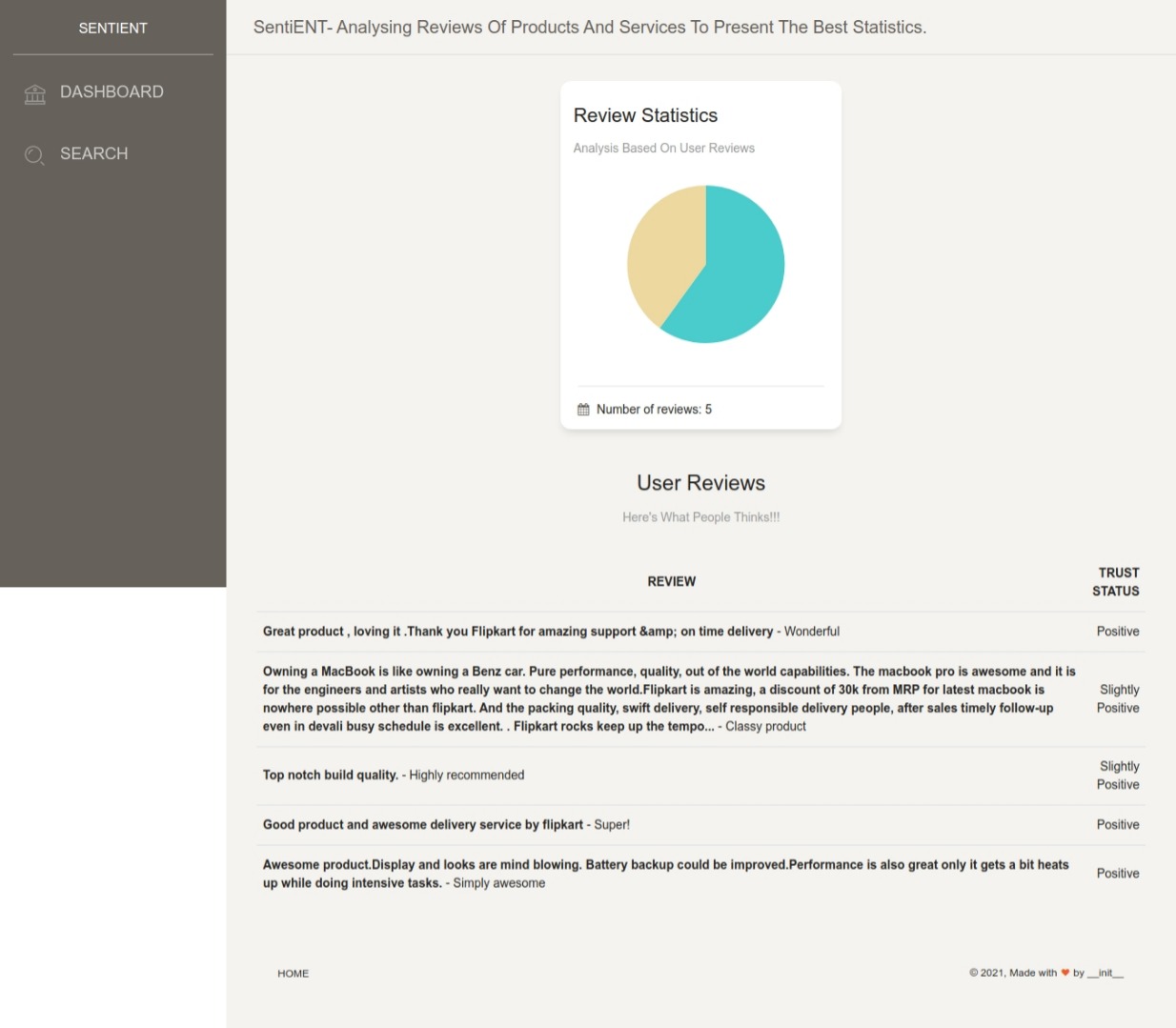 - Data Visualisation:- When we have collected both, Reviews Data as well as thier sentiment score. We display it in the form of Pie & Line charts using chartist.js. The score is divided into 5 segments of mood a.k.a sentiment i.e. Positive, Slightly Positive, Negative, Slightly Negative & Neutral.