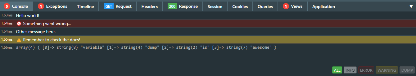 Debugger::dump($myVar); // Dumps a variable to the consoleCapture exceptions and display them in the Exceptions tab: