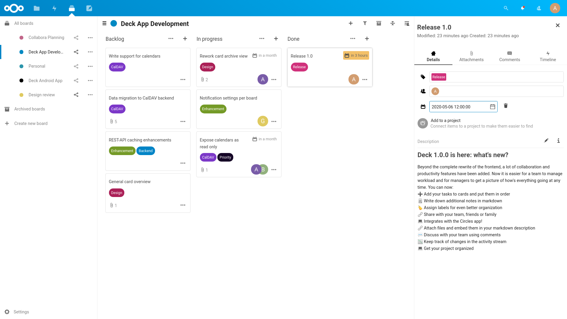 Deck is a kanban style organization tool aimed at personal planning and project organization for teams integrated with Nextcloud.