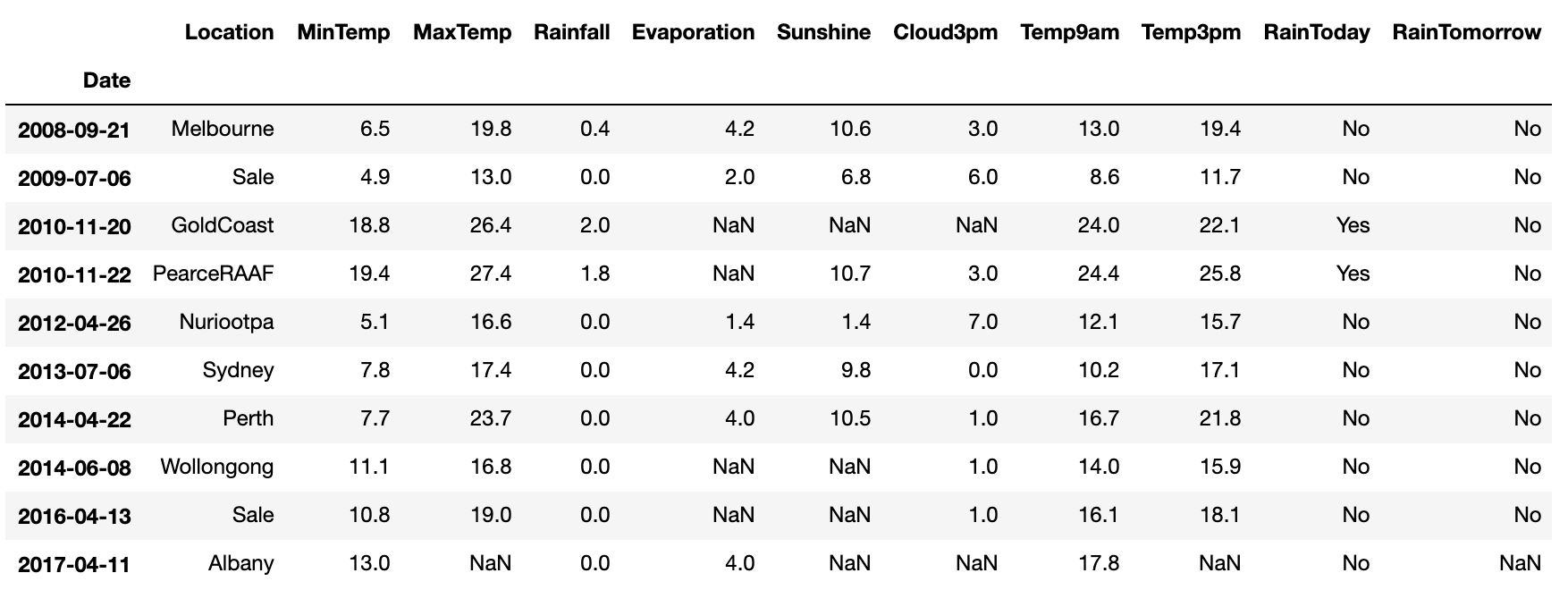 QUESTION: The dataset contains about 10 years of daily weather observations from numerous Au weather stations. Here's a small sample from the dataset: