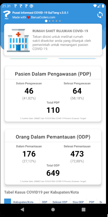 PICO SulTeng (Pusat Informasi COVID-19 Sulawesi Tengah/COVID-19 Information Center of Central Sulawesi) is an android-based application developed to facilitate the people of Central Sulawesi in obtaining information about the current situation of COVID-19 in Central Sulawesi.